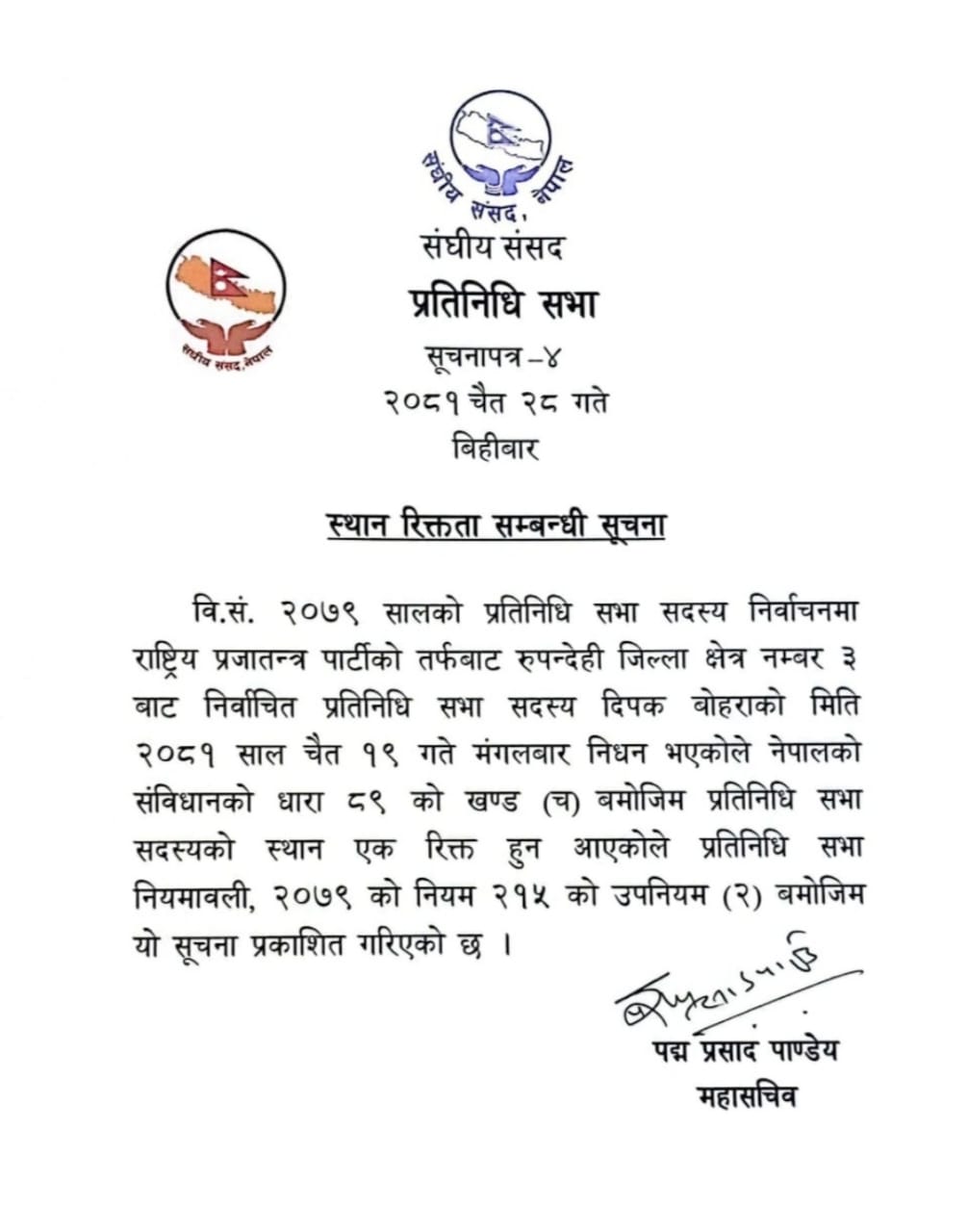प्रतिनिधिसभाले निकाल्यो स्थान रिक्ततासम्बन्धी सूचना