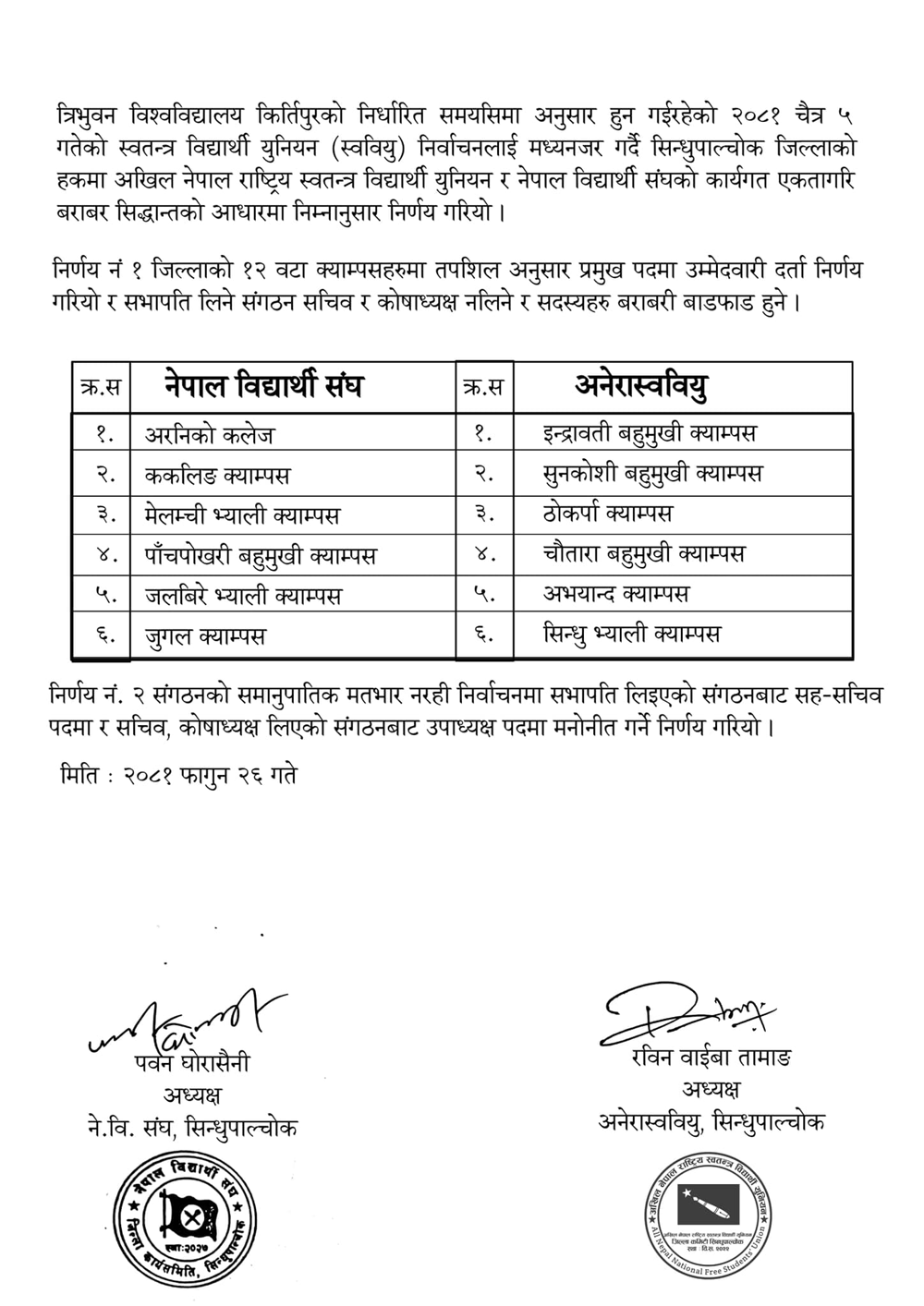 सिन्धुपाल्चोकका कलेजमा नेविसंघ र अखिलको भागबण्डा
