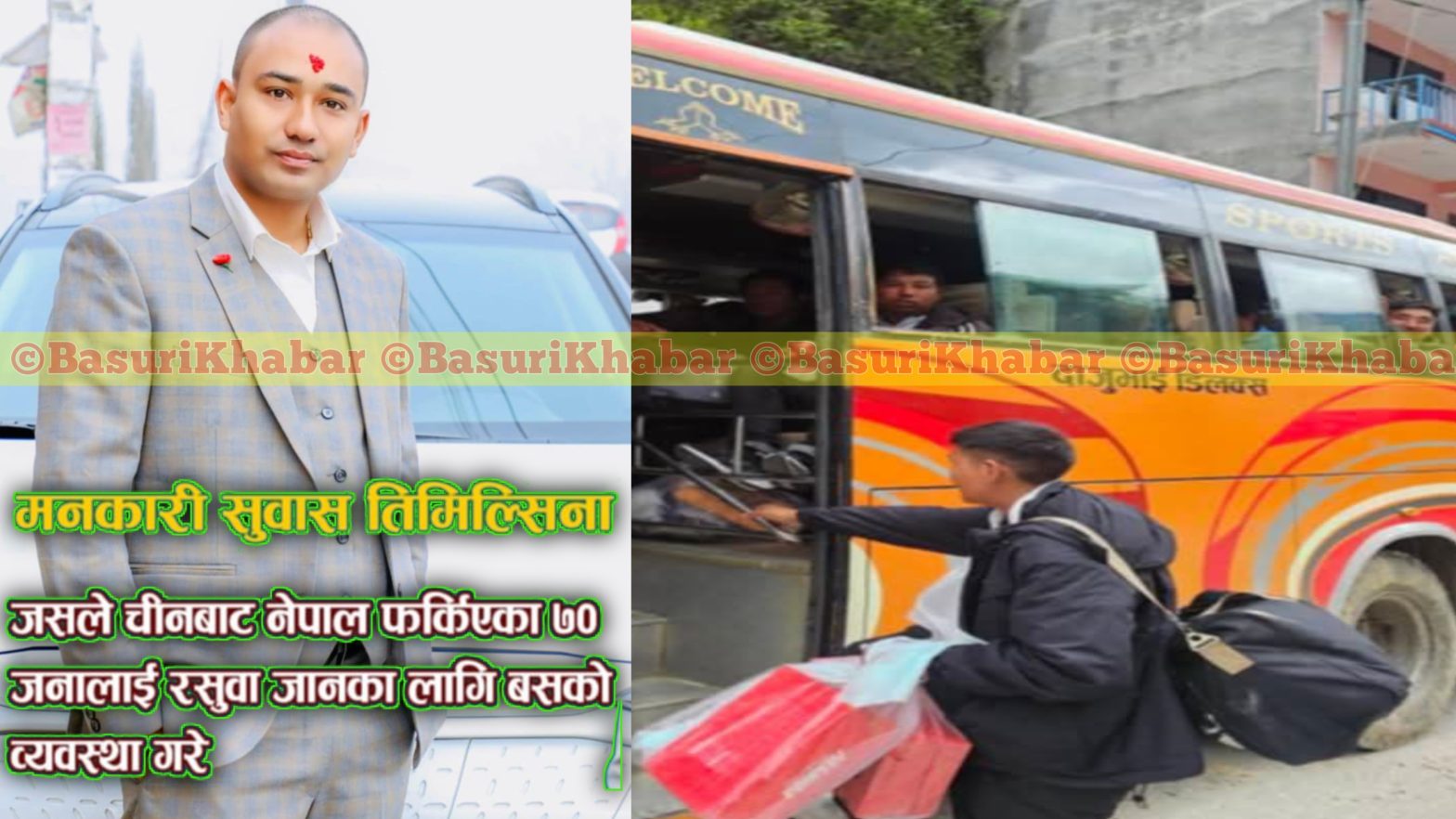तातोपानी नाकाबाट नेपाल फर्किएकामध्ये ७० जनालाई कङ्रेस नेता तिमिल्सिनाद्वारा रसुवा जान दुई वटा बसको व्यवस्था